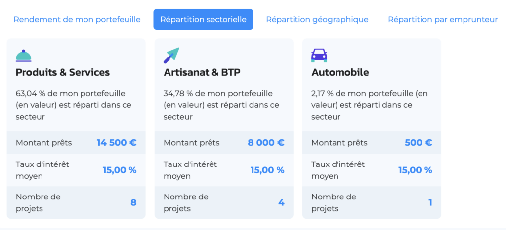 Je ne mise jamais sur un seul dossier ni sur une seule plateforme. Voici la répartition de mon portefeuille sur une des plateformes où je prends le plus de risques.